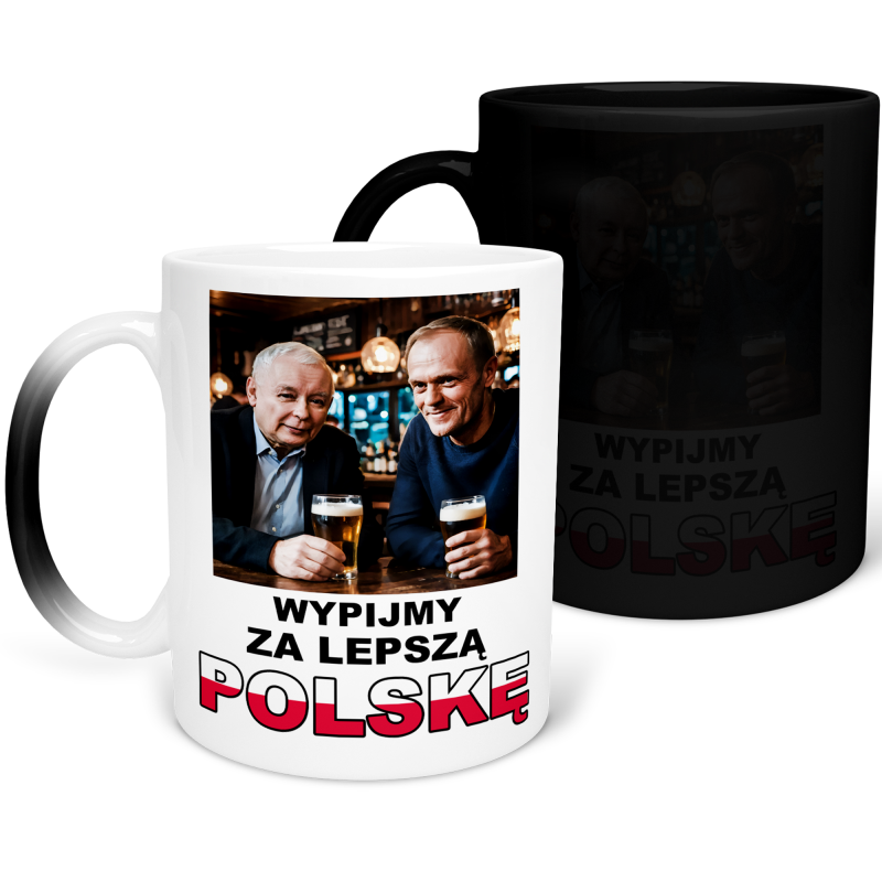 MAGICZNY KUBEK KACZYŃSKI TUSK "Wypijmy za lepszą Polskę" PREZENT 330ml + OPAKOWANIE na URODZINY ŚWIĘTA
