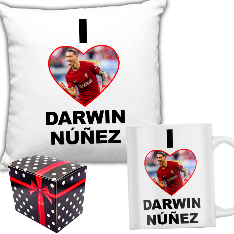 ❤️ZABAWNY ZESTAW PREZENT ŚWIĘTA PODUSZKA + KUBEK I LOVE DARWIN NUNEZ + PUDEŁKO❤️